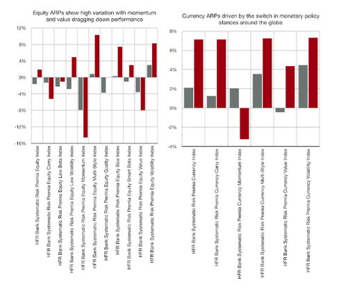 Commodity ARP returns were mixed given the curve fluctuations in the energy sector; however, the long-only smart beta index generated strong returns. The credit ARP sector also was a strong gainer based on the tightening of spreads in tandem with the gains in equity since the beginning of the year. Credit spreads will often proxy for movements in the equity markets; however, equity ARPs were mixed. While some equity strategies like volatility showed strong gains, core strategies such as momentum and value generated marginal returns for this year. With the strong gains across all equity markets, the short sides of ARP trades have been a significant drag on performance. The losers of the fourth quarter were the strongest winners in 2019. Currency ARPs were strong performers based on the changes in the liquidity stance of global central banks. These returns are somewhat high given the absolute movement in currency rates. Rates ARPs were consistent with the momentum moves across the globe as well as recent movements in yield curve. The bundled ARP returns especially in momentum across all asset classes have shown significant through this year.