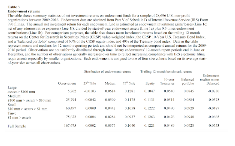 Endowments are supposed to be the smart money, yet if you review the recent exhaustive paper on return performance, you will get a different impression. Large endowments do better than small endowments, but when you compare with a simple 60/40 stock bond balanced fund, there is not a lot of alpha generated. See “Investment Returns and Distribution Policies of Non-Profit Endowment Funds” from ECGI.