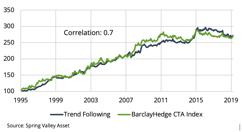 Commodity Trading Advisors (CTAs) are a class of hedge funds that trade primarily in liquid global futures markets. These include currencies, fixed income, equity indices, and commodities. CTAs pursue many different types of strategies. However, research has shown that they predominantly follow trends. Trend following buys assets that have risen in price and sells assets that have fallen in price. The strategy has been robust historically and consistent across asset classes. Using the approach in [1], we construct a proxy trend following strategy. In Exhibit 1, we confirm that our proxy strongly correlates with the BarclayHedge CTA Index.