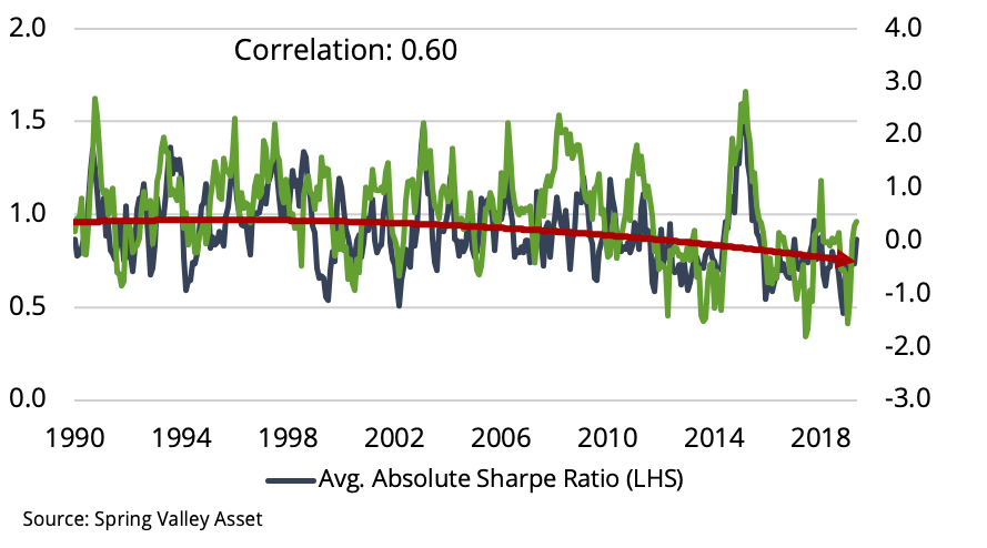 Average Absolute Sharpe Ratio (LHS)