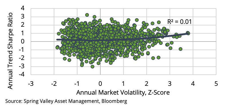 Also, we can observe the relationship directly. We calculate the annual volatility of each market and standardize them over time using z-scores. We then calculate the annual Sharpe ratio of trend following performance in each market. As shown in Exhibit 6, the link between performance and volatility is quite weak. If anything, the shape of the trendline is convex, resembling the relationship between the VIX and CTA performance. Our analysis is consistent with the work of [3, 4] who also found the relationship between volatility and trend following to be tenuous. Therefore, our results suggest that the lack of volatility over the recent decade is a weak explanation for the underperformance of CTAs.