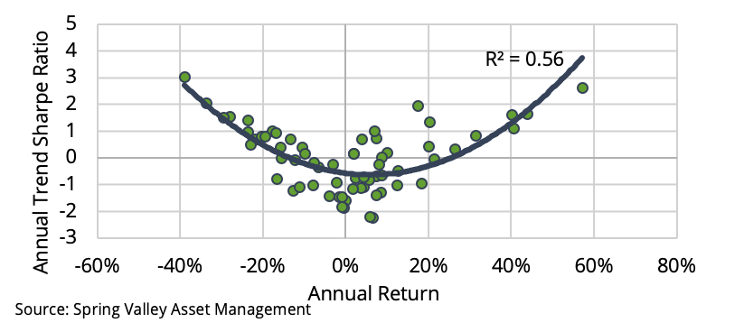 Research shows that significant cumulative returns in the underlying market produce a strong performance for trend-following strategies [6]. As a demonstration, we simulate our trend-following strategy on a random walk. The random walk is unpredictable, and a trend following strategy is expected to yield a Sharpe ratio of zero. However, in Exhibit 7, we observe a robust convex relationship. Trend following performs well during significant cumulative moves in the underlying.