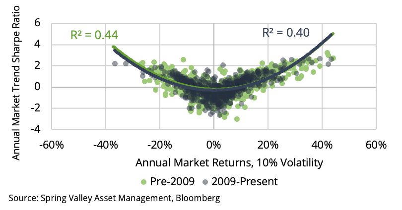 To quantify this effect over our sample, we normalize the daily returns of each market in our universe to 10% volatility. In Exhibit 8, we display the relationship between the annual trend following performance applied to each market and the annual returns of the underlying market. We show the results for the periods before and after 2009. We observe that the relationship has remained stable. Therefore, the underlying dynamics that drive trend following profitability still exist. Also, as in [5], we can conclude that there is no indication of a change in the strategy’s ability to capture trends.