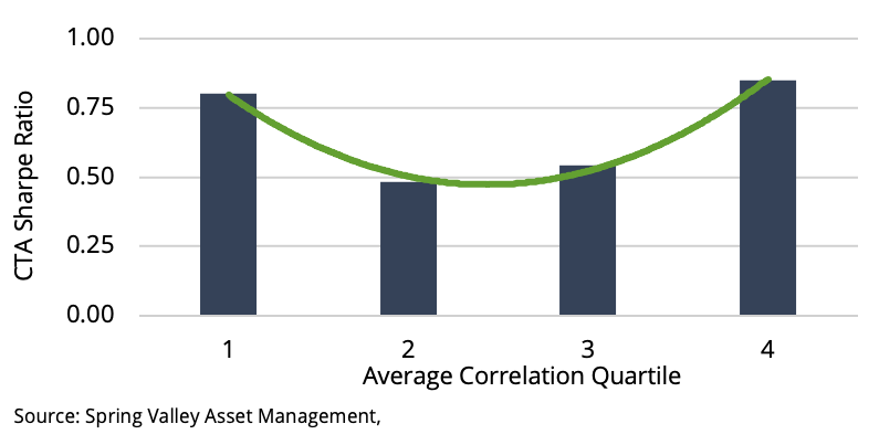 We can conceptualize why CTAs perform well when correlation and volatility are both high and low. An environment where both are high generally coincides with a crisis. An extended period of deleveraging increases the persistence of trends. Since they are highly correlated the effect is pervasive. On the other hand, the ideal environment for CTAs is when both are low. In low volatility environments, prices are slow to absorb new information which results in trends. This information also diffuses slowly across related markets. CTAs can also achieve greater diversification from lowly correlated markets.