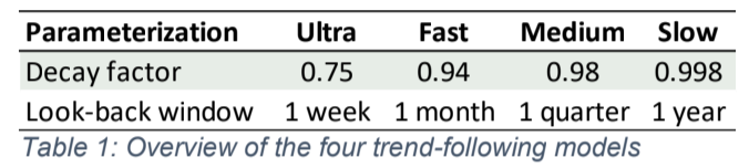 To perform the analysis we designed a generic trend-following model using a trend signal based on an exponentially weighted average of risk-adjusted past returns. We then applied a generic bottom-up portfolio construction method using a continuous, increasing and bounded risk-allocation signal function, and an implementation methodology aiming to minimize the number of transactions. This trend-following model is then applied to an investment universe of 62 of the most liquid futures contracts to obtain a portfolio return with an annualized volatility target of 12%. All simulated returns incorporate realistic trading costs of USD 40 per contract traded, but do not account for any roll costs, risk free return on cash, or any management and performance fees. Having specified the generic trend-following model, we will focus on the parameter of interest: the exponential decay factor, which reflects the speed or look-back window of the trend-following signal. The following four decay factors corresponding to different look-back windows will be considered.