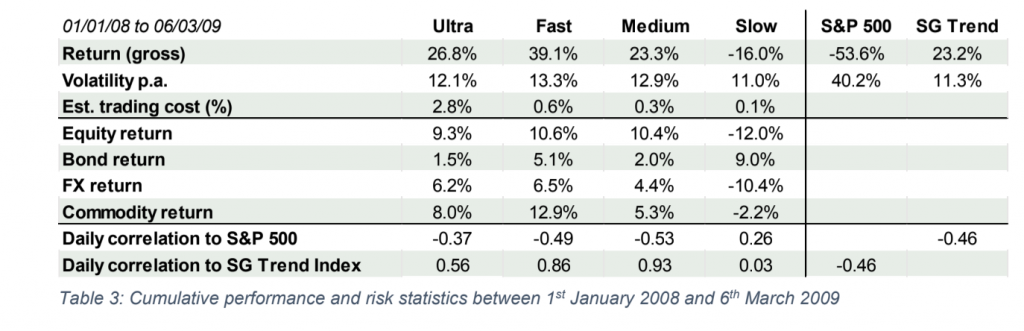 Q1 was not a result of short positions in equity markets, but rather that of strong profits in diversifying positions, mainly long positions in bonds, short positions in energy markets and short positions in FX markets against the USD. Corona Crisis and the Financial Crisis of 2008: a comparison Looking back in time, the market environment that comes closest to the one we are currently witnessing is the financial crisis of 2008. How did the return dispersion – as a function of the speed of trend-following models – look like back then? Table 3 shows that, when analyzing our four generic models over the period from 1st January 2008 to 6th March 2009, dispersion was much less pronounced between the Ultra, the Fast and the Medium model. It was only the Slow model that underperformed considerably. Noteworthy is the correlation structure between the four models and the SG Trend Index, as illustrated in Figure 4.