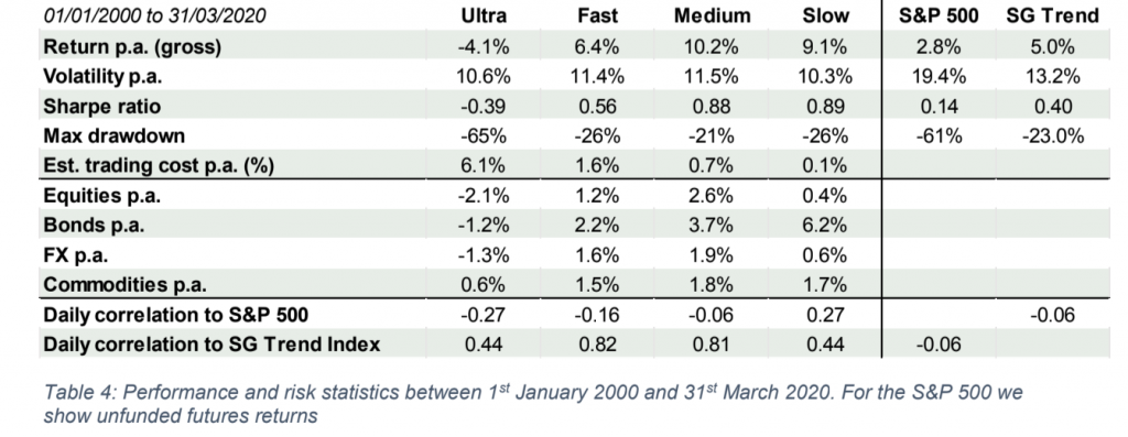 While the Ultra model delivered strong returns during the two above mentioned crisis periods, it failed to deliver positive results over the long term (-4.1% p.a. between January 2000 and March 2020). Around half of the underperformance against the Fast model is explained by the additional transaction costs of around 4.5% p.a. versus the Fast model. The best long-term results are achieved by the Slow and the Medium model, with a (gross) Sharpe-ratio of close to 0.9 and corresponding transaction costs of less than 1% p.a. Over the 2008 and 2020 market crises the Fast model outperformed the Medium model by a combined 28%. However, this significant ‘crisis alpha’ comes at a long-term premium that amounts to +3.8% p.a. over the last 20 years, or