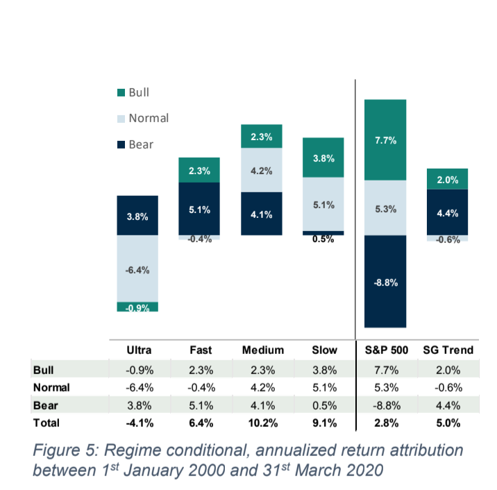 It highlights an important and well-known feature of trend-following programs: Independent of their speed, trend-followers have offered strong downside protection over the last 20 years, demonstrated by the positive returns generated in the Bear market regimes. Historically, this crisis protection has been higher for the Ultra and the Fast model, but this comes at a cost: While on