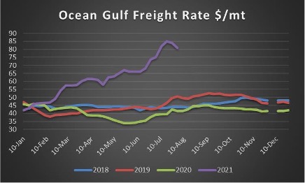 Chinese grain import margins have been hit with a confluence of factors that have caused them to contract dramatically, from lower domestic prices in China, lower hog prices and sharply higher freight. The chart to the right shows ocean freight rates from the U.S. Gulf to Japan for grain shipments. Not a grain quote but illustrative of the overall shipping increase: spot containers from China-U.S. East coast have climbed over 500% from a year ago, reaching $20k this week, compared to $11k at the end of July. China to the U.S. west coast is slightly below $20k and China-Europe is nearly $14k. Domestic feed use will likely stagnate over the next 12 months but lower global corn production in Brazil and massive losses of all crops in Canada are likely to become supportive factors to corn within the next 60 days.