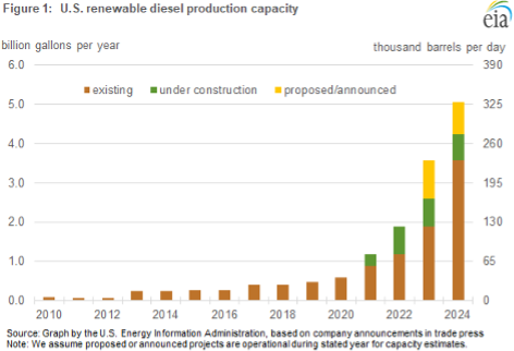 Turning our attention to soybean demand, freight rates have had a similar effect on Chinese crush margins which are currently unattractive and has some lowering imports for 21/22. We do not anticipate any meaningful decline in Chinese bean demand and the demise of the Canadian Canola crop (20% or more below current WASDE estimate) is supportive to soybeans/ soybean oil in the fall and winter. There is still uncertainty how large and how fast renewable diesel production will contribute to soybean oil demand for 21/22 but the projects under construction / proposed are significant (see attached chart). The EIA estimates capacity at the end of the year at 1.2B gallons and almost 2B by the end of 2022. Using the estimates above and a conversion rate of 7.6 lbs. of vegetable oil per gallon of renewable diesel would imply total oil use 9.1B lbs. Not all of the feedstock will come from soyoil, but it could become a structural market changer.