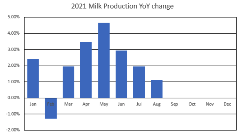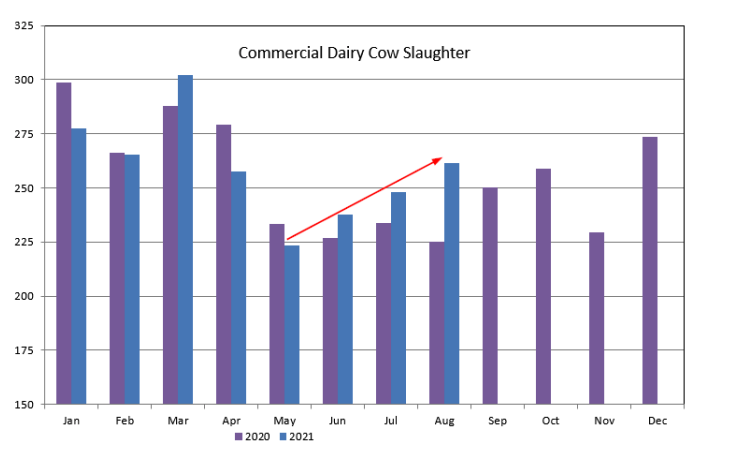 The USA has been the only major dairy production region with sizable growth, but even that appears to be slowing (see graphs). The most recent numbers from USDA show that Year-over-Year growth in milk output is slowing. There are several reasons for this. Feed costs are much higher (corn, soybeans), increasing the cost of production, while beef prices are strong. Dairy operations are therefore getting more aggressive in culling their herds (fewer mouths to feed and needed cash from cull sales). August slaughter numbers were up 16% vs. a year ago. As a result, the total dairy herd in the US, while still very high, is finally starting to decline, shrinking nearly 20,000 head from July to August.