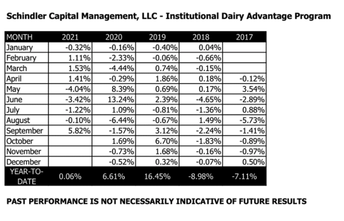 The Institutional Dairy Advantage Program picked up 5.82% in September, to bring the YTD ROR to 0.06% at the end of Q3. Gains in October through 10/14 now have the program up 4.85% YTD.