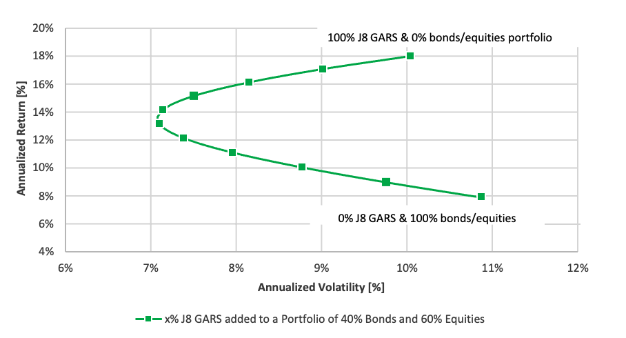 Figure 2 illustrates the improvement of the efficient frontier of a 60/40 portfolio when the allocation to J8 GARS is incrementally increased.