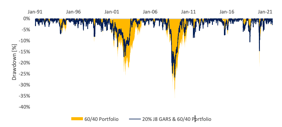 Figure 1 below juxtaposes the drawdowns of a classical 60/40 portfolio with a 60/40 portfolio that contains 20% of J8 GARS. The drawdowns with J8 GARS included are less, and the recoveries are shorter.