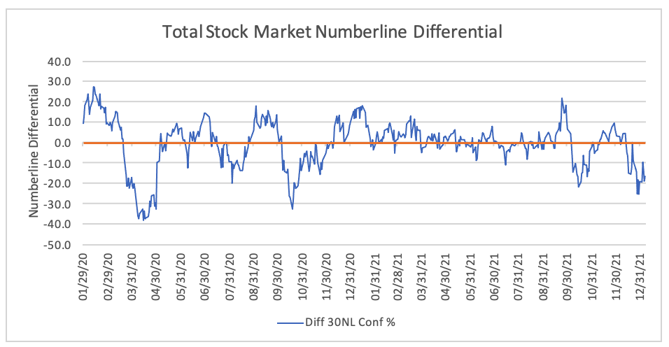 This indicator continues to be awful. This is a list of the internal number line scores for 3,000 stocks. The numberline score is a quantitative score our program gives each individual stock each day based on how the stock trades. The scores are aggregated over the entire database, and we get this output which gives us the internal strength of the market. This has been the same story all year. A few very strong large-cap growth stocks and the rest of the market are struggling, especially the small-cap and value names. We are likely seeing this indicator improve dramatically this year. However, if it comes at the expense of the large-cap names, the overall indices might end up being very choppy at the index level.