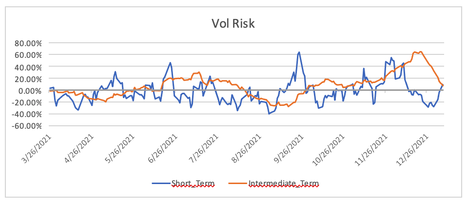 As you can see, this thing started flashing warning signals in Sept. While equities were not much perturbed by it, volatility in the rate and FX market was at levels we last saw during the peak covid selloff. So, this “disturbance” in risk assets has been going on for four months now and is probably closer to the end than the beginning. The intermediate signal is calming down and the short term is still agitated by the violent re-positioning that has so far taken place the first week of the new year. We probably have another week or two of this re-positioning before things calm down.