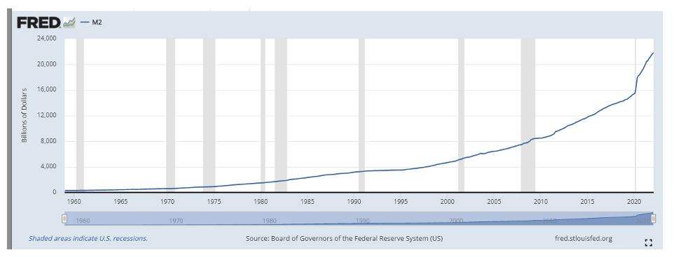 Like many things, rising wage growth is a double-edged sword. Ultimately, costs are passed down to end customers.  We see this with the highest level of inflation seen since January of 1982 at 7.9%. Energy costs continue to be a significant driver here, even before the Russian invasion of Ukraine. This coincided with a supply chain crisis spurred on by stimulus spending for durable goods.  We see signs that pandemic support that allowed investors to save more money is running out.  Credit card debt increased by $41.8 billion in the US in February, up from an $8.9 billion increase in January, and appears to be accelerating.  This shows that while wage growth is strong, it is not keeping up with inflation. An increase in money supply coincided with these signals as well.  The chart below shows the noticeable uptick in 2020 that continued.