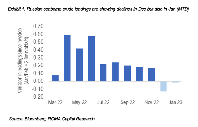 Russian seaborne crude loadings are showing declines in December, but also in January (MTD)