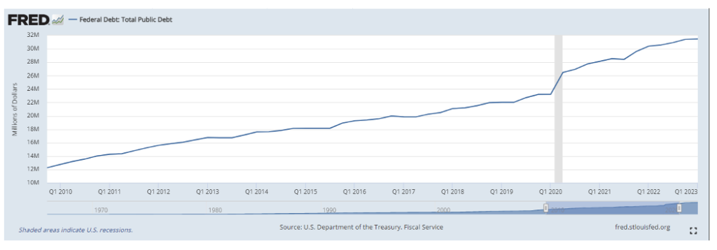 - US public debt increased from $12.3T to $31.4T since the beginning of 2010, a 255% increase (See chart)