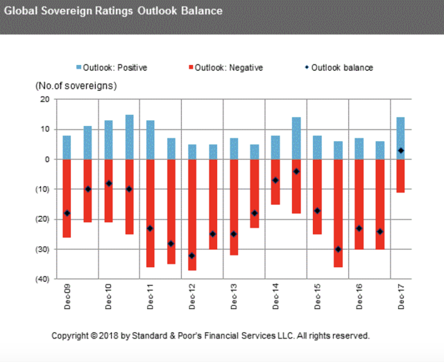 A year ago the market was concerned about global credit risks. The sovereigns with a negative outlook were high and the number of positive outlooks was low, but that has changed in one year given the improvement in global growth. The number of negative outlooks is at post Financial Crisis lows, the positive outlooks are high and the balanced outlooks are positive for the first time. The balance has improved markedly across regions but especially in Europe and the Middle East. The chance of default risks has fallen given credit quality is improving.