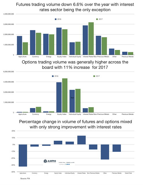 Global financial markets performed very well but you could not tell by looking at the volume of trading on futures exchanges around the world. The year-end numbers from the Futures Industry Association (FIA) show that futures trading volume was down over 6%. Options volume was up 11% and overall futures and options volume was flat for the year.