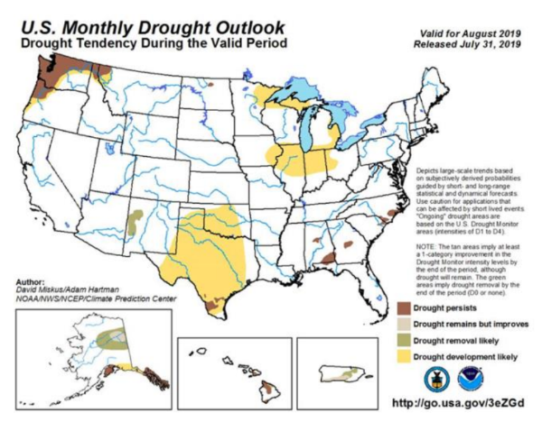 Following up on last month’s commentary, July featured lower than average rainfall and higher than average temperatures across most of the US’s primary growing regions. Interestingly enough these results were quite different than the NOAA long-range forecasts issued for the month. Specifically, most of the Corn Belt experienced maximum temperatures that averaged 2-4 degrees (F) above normal. As you can see on the left even with this year’s extremely wet spring, drought conditions are expected to develop in key growing regions of IA, IL, and IN. This is definitely something to keep an eye on as near perfect conditions will be needed to substantially increase row crop yields at this point.