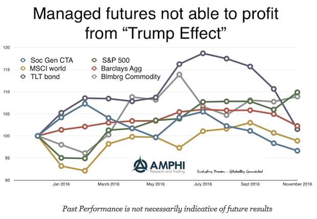 A large sell-offs in bonds both domestically and around the world, a strong US equity move, and a strong dollar trend that changed perceptions on currencies, did not create an environment where managed futures were able to generate positive returns. I don’t want to be accused of hindsight bias, but a review of price trends in bonds and the dollar going into the election suggested that post-election moves, while extended, were not inconsistent with longer-term trends. Still, an early review suggests that there have been some major winners in this space who will end the year with strong positive gains. Careful CTA manager selection has meant the difference between success and failure in 2016.
