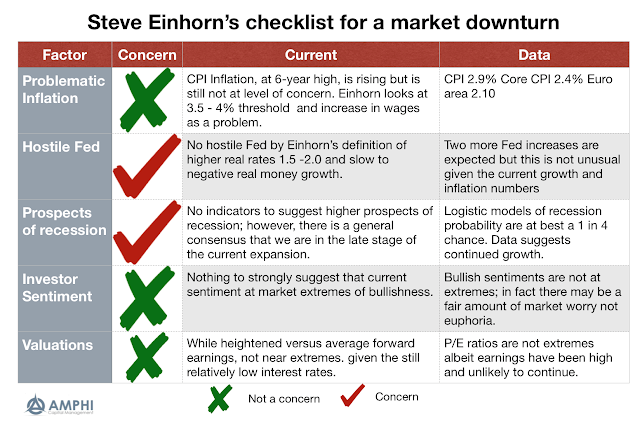 Recent interviews with Steve Einhorn, the long-time hedge fund manager, provides his checklist for when a bull market may turn into a bear market. It is not supposed to be a definitive forecast, but a good simple indication when conditions are ripe for a change. See Boyer Blog and Barron’s .