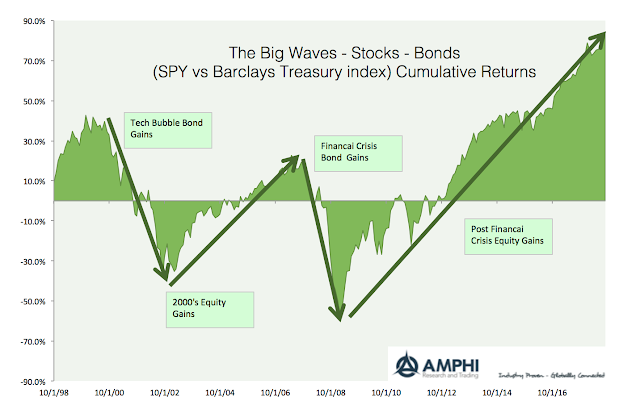 Simple visuals can be very powerful at telling an effective investment story. I have compared equities, bonds, and commodity relative returns for the last twenty years to see the big wave cycles that investors needed to participate in to have a successful portfolio. The trends from these asset class cycles are long. An investor does not have to get in on the turning points, but they do need to hold the trends as long as possible. The secret to relative asset class success is commitment.