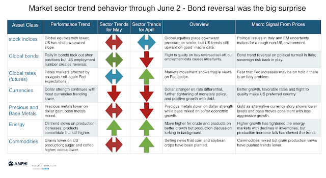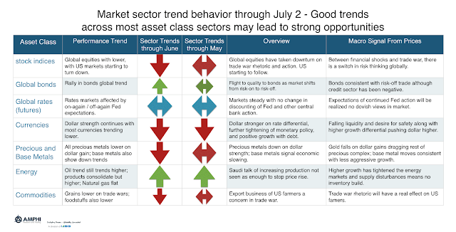 A review of trends in each of the major asset class sectors shows that there should be a strong return opportunities in July. Global stock indices are declining on trade war rhetoric and action. This growing sense of risk has spilled-over to bond markets through classic risk-on/risk-off behavior. Bonds have gained even with the threat of higher inflation. The dollar looks to continue its up trend as money flows back to the US and away from EM. Precious metal prices have fallen on the dollar strength. In spite of the Saudi’s willing to increase oil production in response to falling inventory, oil prices have continued to trend higher. Grain prices have fallen on fears of a trade war in agricultural exports to China. The general direction in commodity prices has been lower.