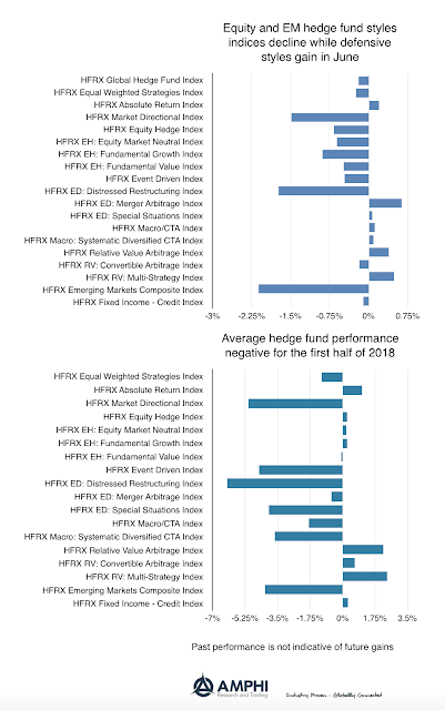 Hedge fund styles as measured by the HFR indices, on average showed negative performance for June. EM strategies were the hardest hit sector. The only bright spots were merger arbitrage, defensive strategies like global macro and relative value. The general decline in equity markets globally and more mixed performance in the US held back returns.