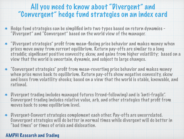This is the second in our series; all you need to know about a topic should fit on a “3 by 5” index card. We think the complexity of hedge fund investing can be simplified if the simple dichotomy of divergent and convergent trading is used as a primary method of describing potential return pay-offs.