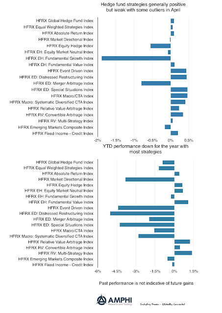 Most hedge fund strategies were positive for April, but the average return was less than 50 bps. There were two negative outlier strategies with fundamental growth and merger arbitrage. Generally, the higher monthly volatility and dispersion created a mixed environment for return generation. Year to date returns suggest that it has been a difficult four months for most managers with average loses much larger than the average for the winners and only 7/19 strategies producing positive returns.