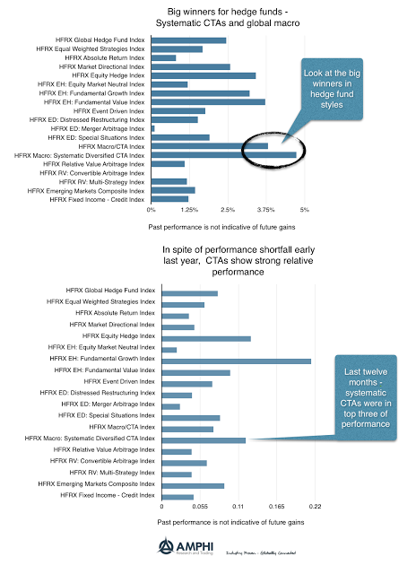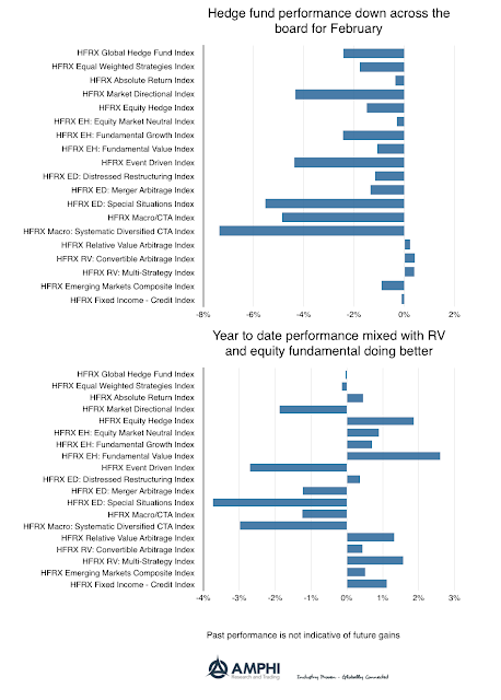 Hedge fund performance, as measured by the HFR indices, showed strong performance in January especially for global macro and systematic CTAs. Systematic CTAs also generated returns that were in the top three categories for the last twelve months.