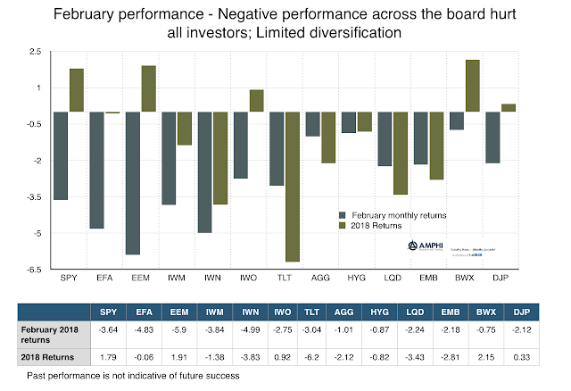 February was a bad month for investment performance. All of the major ETF indices we normally follow were negative. Diversification was an elusive concept and reinforced the key portfolio allocation risks of rising correlation. There is no positive spin with these numbers other than less risky assets like bonds fell less than more risky assets, although year to date numbers show that bonds have not been a safe haven. There are a few takeaways from the month: