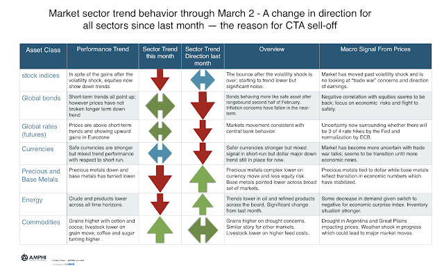 A review of the trends that current exist across market sectors suggest that there is significant noise about directions and fundamental changes from last month. The equity bounce post the volatility shock seems to have played out and now new information such as “trade wars” seems to be defining new trends. Bonds seem to be moving back to the core negative correlation with equities. The dollar sell-off also seems to have paused except for traditional safe asset currencies. Metals are now trending down but commodities are responding to a weather shock. While there may be profitable opportunities later this month, current signals are mixed.