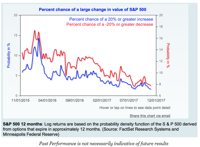 From the Minneapolis Fed we have market-based probabilities of a large up or down market move embedded in 12-month options. This is a good market-based view of a large up or down stock market move.