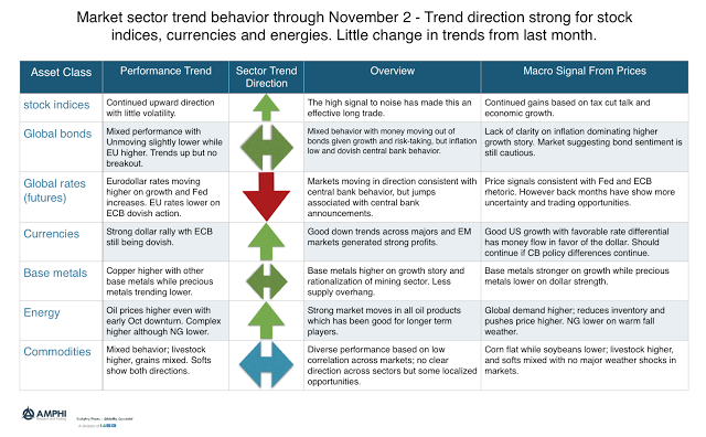 You could call it the second reflation trade. Based on economic data trends which suggest stronger global growth coupled with tax reform/cut talk, we are seeing major sectors show increasing trends and opportunities. The good October trends seem to be carrying over to November. The reflation trades has driven stock indices, energy, and base metals prices higher. The differential between monetary policy in the US and the rest of the world also suggests dollar strengthening. The rate differential is in favor of the dollar. This dollar strength places downward pressure on precious metals. Bond price behavior has been a little surprising with some recent gains in spite of the strong growth story.
