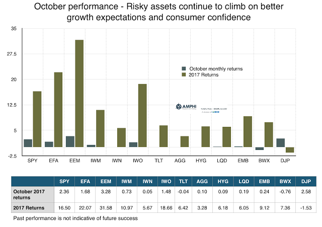 Talk of tax cuts floating through the halls of Congress coupled with stronger consumer confidence allowed risky assets to continue marching higher. Warnings of overvalued equities, concerns over leverage, and higher geopolitical risks, have not stopped stocks from stronger gains around the globe. For US companies in the third quarter, 76% have shown positive earnings surprises and 67% have had positive sales surprises. The earnings growth rate is 4.7% for the third quarter according to Factset. Positive economics, good company performance, and low volatility all contributed to this continued rally.