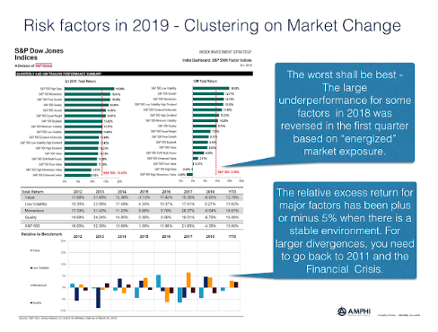 An analysis of the first quarter tells us a lot abut factor investing in the short-run. Foremost, the worst factors last year are the best for this year. Factor risks change with the market environment as shown through the global factor indices from S&P Dow Jones. Factor rotation occurs, but not clear that it is predictable. Factors effects also can be swamped by the impact of large macro events.