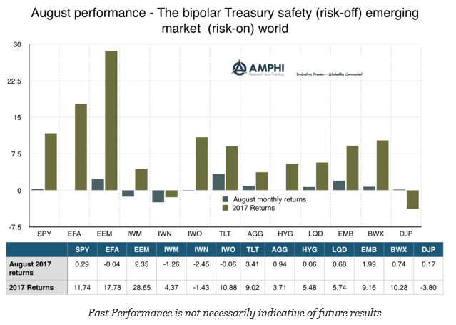 August showed growing dispersion across styles, sectors, countries, and bonds. For example, there was almost a 5% difference between holding the emerging market and value ETF’s (EEM-IWN) For sectors, there was an 8 percent differential between energy and technology (XLE – XLK) and a 3.5% difference in bonds between long-term Treasuries and high yield (TLT – HYG).