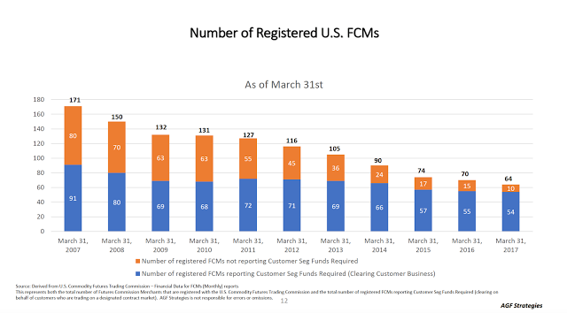 Market structure matters regardless of the industry. The interaction of economic agents will impact market behavior and drive pricing. Competition reduces markets frictions and transaction costs. If there is less competition, the cost of execution will be higher, and there will be less liquidity. This applies even to highly regulated markets like futures trading. A simple graph shows the decline in the number of FCM’s operating in the futures markets. The number has been cut in half since 2011.