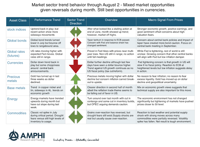 For trend-followers in July, currencies were the big winners. Strong trends with relatively low volatility made for many winning trades. These trends as well as moves in precious metals are likely to continue in August. Currently, this is the place for greatest upside opportunities. The currency moves did see some short-term reversals around central bank and key economic announcements which may have hurt traders with tight stops, but the general direction in 2017 continues.