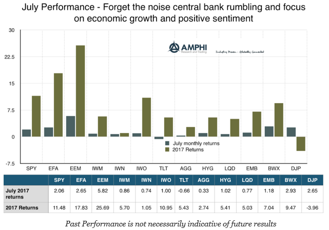 The drumbeat of over-valuation continued in July, but investors do not seem to be listening to any negative stories as stocks around the world continued to move higher. The view that economic growth will pick-up in the second half of the year coupled with rosier earning forecasts have pushed equities higher. Any worry about valuation will be for tomorrow. Today, the focus is on buying risky assets around the world.