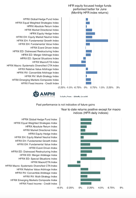 The equity focused HFR hedge fund indices produced positive returns for the month of June while those indices focused on broad-based macro trades declined. Equity focused hedge fund managers will often do better when there is more dispersion across industry sectors and when there is stronger performance in broader-based indices like the Russell 2000. The market saw strong gains in both growth and value indices and less emphasis on large cap names. The fall in tech stocks which have been at elevated levels may also have been a contributor to some hedge fund gains.