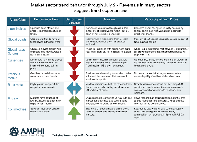 Trend traders were hit with a number of significant reversals in major asset classes near the end of the month. Bonds were rocked with a possible ECB “taper tantrum” albeit it is early to say that this will be like what was seen in the US. No two market tantrums will ever be the same. Equities are in a trend decline in Europe and the US has started to trend lower although the month still generated positive gains for many investors. There is an equity rotation away from large cap indices, but it is hard to take advantage of in futures. The dollar also trended lower near the end of the month only to see some gains in the last two trading sessions. Many commodities moved higher on weaker supply reports and oil products has bounced off the declines from the past few weeks. Last week was the major reversal period.
