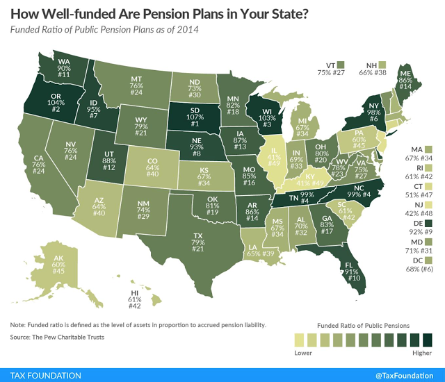 The Tax Foundation map of state funding ratios for public pensions is very sobering. The amount of state under-funding is significant. These numbers are determined by the discounted expected liabilities relative to the assets held. To stay even with these ratios and assuming there is no surprise increase in liabilities, the states have to return the discount rate. These discount rates or expected returns seem unrealistically high.