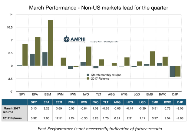 The capital flows and returns for the month and quarter tell a risk-on story for global markets. This is not the case for the US where equity returns were at best flat and bonds showed negative returns in March. The dollar sold off for the month by slightly less than one percent as measured by the DXY dollar index. Even if we account for the dollar tailwind for international stocks, global equities did better than the US by well over 2% for March. Emerging markets have seen the best quarter in years with double-digit returns. Adjusting for the dollar would have placed international and emerging market bonds in-line with US bond returns.
