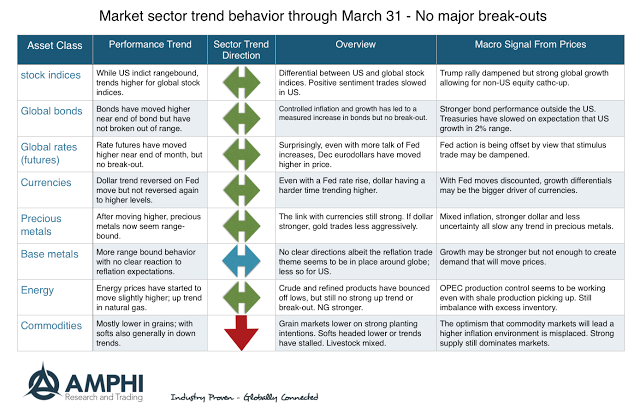 March saw a significant rotation in return performance from US equities to global and emerging markets and from value to growth. Our indicators show prices are starting to break to the downside albeit trends are currently flat. March was a transition month from euphoria to reality concerning US government policies. Future price direction will be determined by the real economy and not policy expectations.