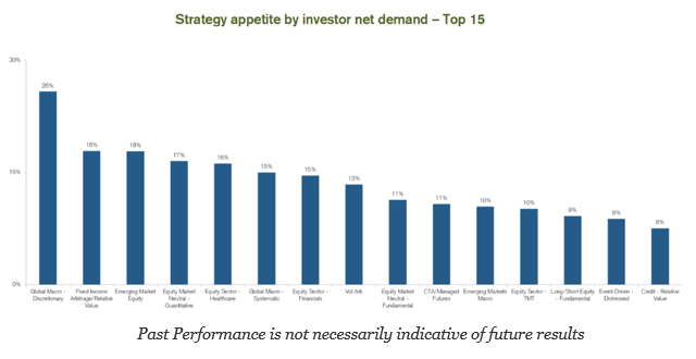 The latest Credit Suisse hedge fund survey for 2017 provides a detailed review of where there is the most investor demand for hedge fund strategies. Number one is global macro based on a desire to have greater portfolio diversification. This appetite is followed by fixed income arbitrage. The swing in demand shows a movement away from long-short equity and a movement to credit and sector specific strategies.